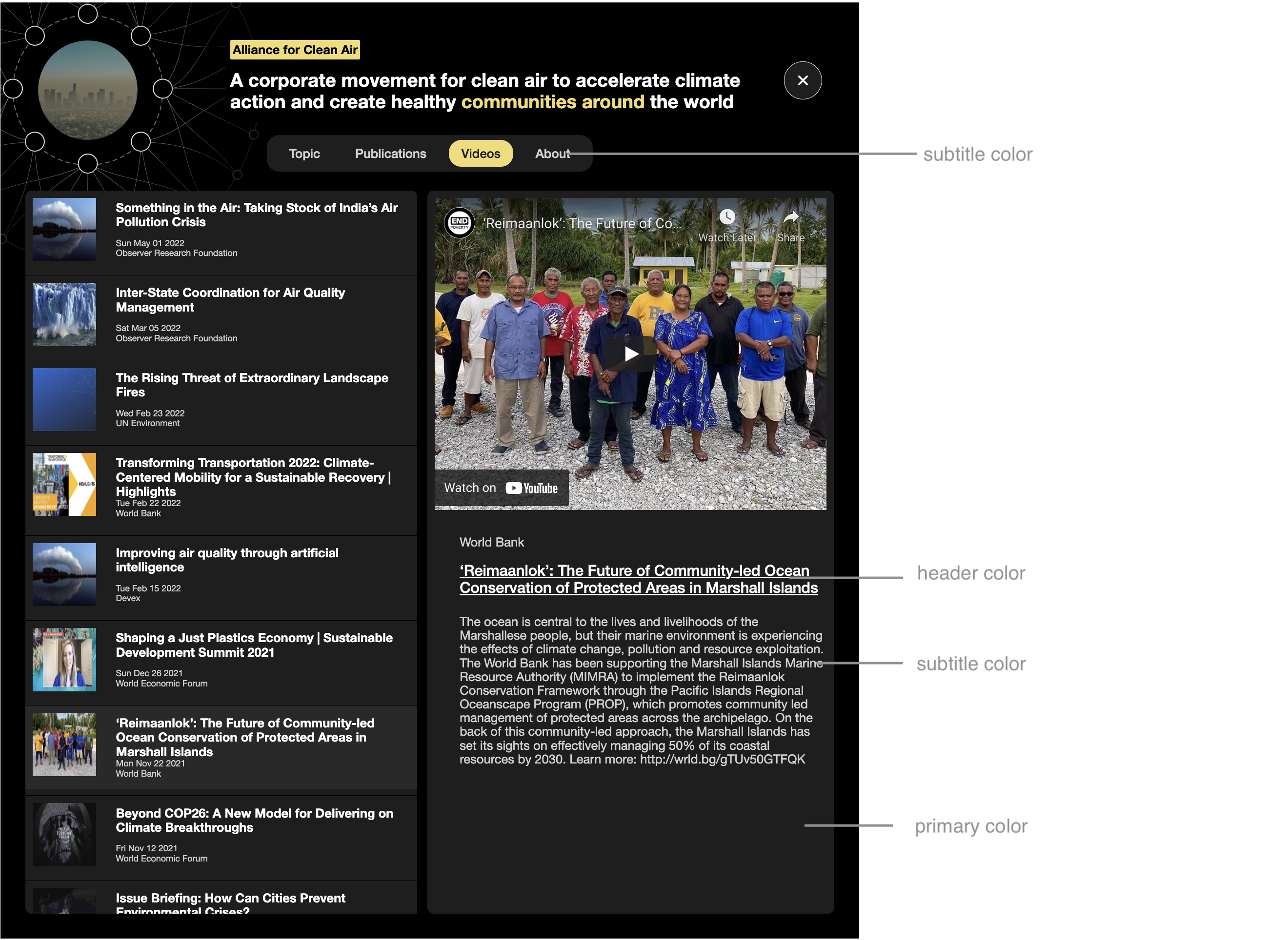 | language | Choose which language the content should be in | This will set the language of the topic map, and headers/ text seen in the widget. It does not guarantee that the articles presented will only be in this language however. Supported languages are “en”, “pt”, “zh”, “es”, “ja”, “ar”, “fr”, “de”, “hi” and “ko”. Defaults to “en” |